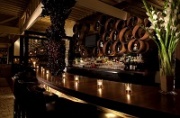 Decorated in rich mahogany woods and deep reds, it creates a warm and rich environment. A bar sits along one side, filled with spirits, wines and decorated with old wine barrels. Bar stools and high tops sit along the bar, allowing for patrons to have a drink before dinner, or to simply come in for a drink if they wish. There is a hallway off the bar that leads to a deep red curtain with a sign that indicates it leads to private meeting rooms and to call to reserve one. An elevator sits off to the side with a keypad.